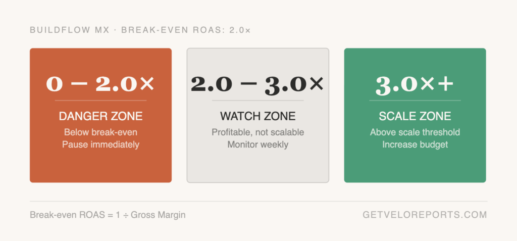 A practical example: BuildFlow MX, a DTC brand selling productivity tools, has a 50% gross margin on their core product. Their break-even ROAS is 2.0x. Their scale threshold — the ROAS at which they confidently increase budget — is 3.0x. Any campaign returning between 0 and 2.0x ROAS is classified as Danger Zone. Campaigns between 2.0x and 3.0x are Watch Zone: profitable but not yet worth scaling. Above 3.0x is Scale Zone.