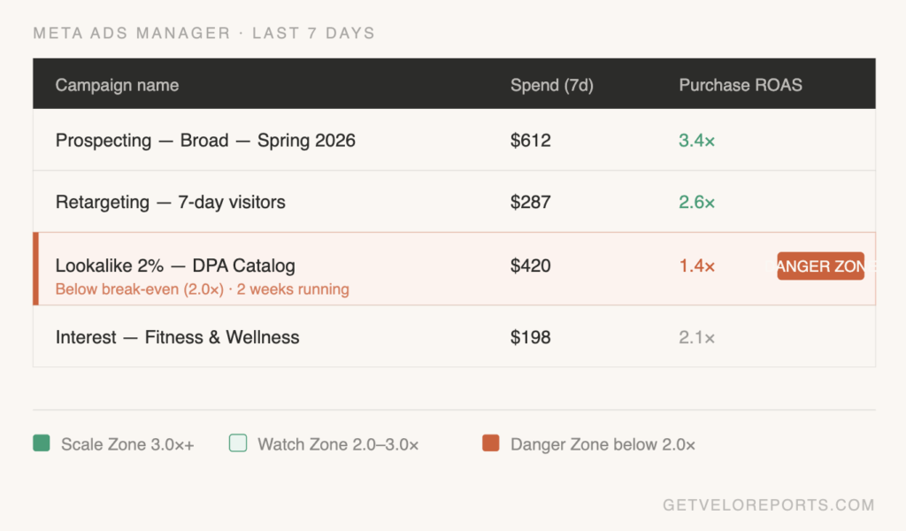 This is exactly what Velo’s weekly report automates — flagging Danger Zone campaigns every Monday before you check your dashboard.