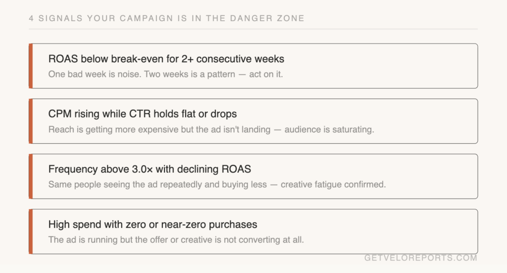 Any one of these is worth investigating. All four together means the campaign is in the Danger Zone and needs immediate action: pause, restructure, or reallocate budget.